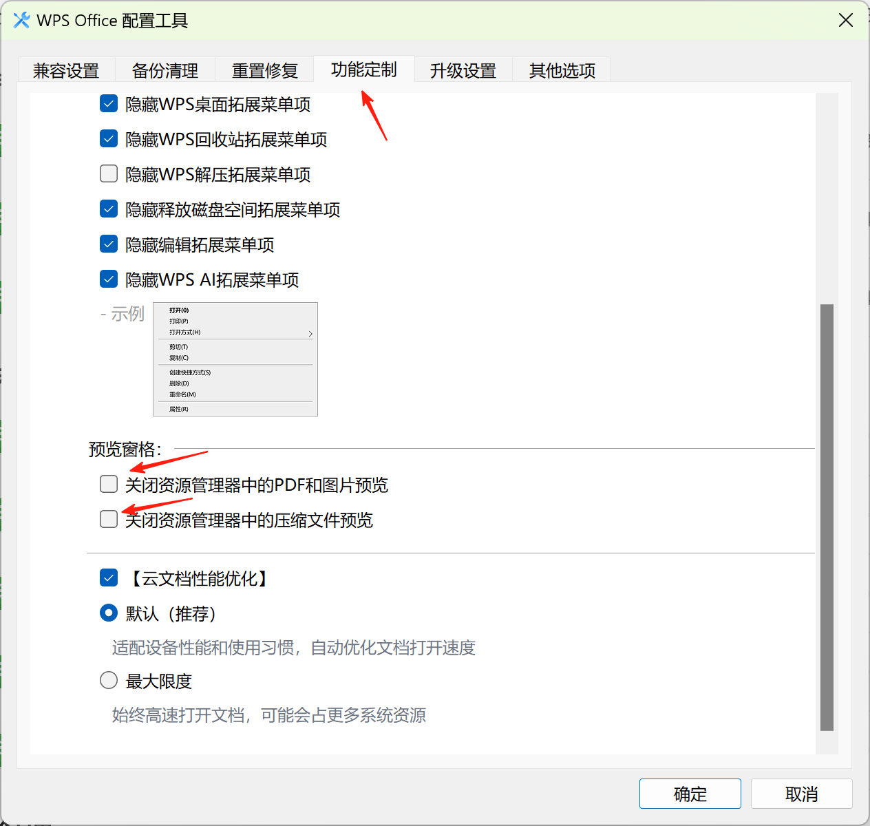 4点击功能定制,点击关闭资源管理器中的PDF和图片预览即可